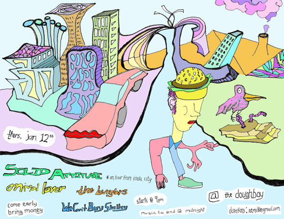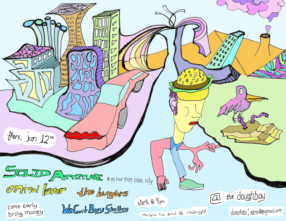 Like I mentioned, Solid Attitude is playing a house show at The Doughboy tomorrow with local outfits Animal Lover, Burglars, and We Can’t Bury Shelley. Whole shebang starts at 9 p.m. If you’re interested in going, get directions by e-mailing rotmilk [at] gmail [dot] com. Here’s the show flier.