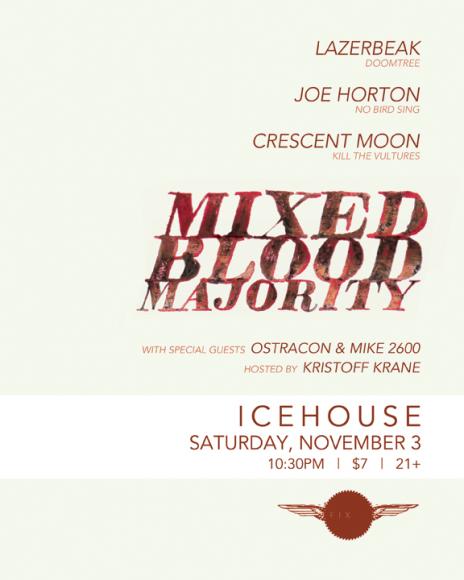 The term “supergroup” is tired and overused, especially in a music seen that is as intertwined as the one we have here in Minneapolis/St. Paul. That being said, I won’t use the weary “S” word, but Mixed Blood Majority, featuring raps from scene vet Crescent Moon and Joe Horton (No Bird Sing) and the beats of Lazerbeak, would fit the description. The trio released their first song, the dark banger “Fine Print,” and it is as great as one would expect when you bring together these three names. Lazerbeak is at his minimalistic best, with twinkling keyboards and crisp drums creating an eerie, foggy atmosphere for these two MC’s to spit over. It is interesting to hear these two rappers on the same track, as their baritone vocals are similar and I have always thought Horton was influenced by Crescent Moon’s serious, gruff rhymes. If “Fine Print” is any indication, the debut album from MBM, which drops in January, will start off 2013 on a very strong foot will continue the winning streak that the local rap scene has been on lately (P.O.S, Guante, Ali, etc). Catch the group tonight at Icehouse on Nicollet for their debut performance.