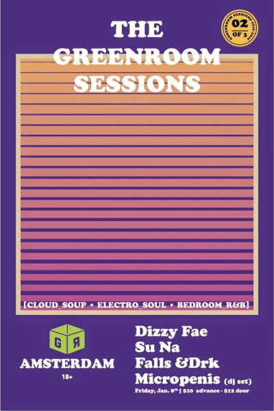 Four issues deep and spread across 20 states, Greenroom Magazine has been on the pulse of what’s new, fresh, and exciting across the national musical landscape. Greenroom Presents, the wing of Greenroom that has been presenting some of the best events in the music scene this year, have been curating a series of shows that showcase the new talent on the rise in the local scene with the Greenroom Sessions. The first series at Icehouse saw folks like BK-One’s new project Bones & Beeker, R&B wunderkind Mina Moore, Beatmaker/Producer Kwey, and DJ Sarah White. This second series is no different, since on January 8th at the Amsterdam in Saint Paul, Dizzy Fae, Su Na, Falls &Drk, and Micropenis will be taking the stage. To get a feel of each artist, check the links below, and make sure you go to the Amsterdam on Friday, January 8th to check out some of these awesome artists in their own element.